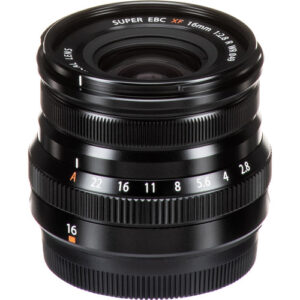 Continuing FUJIFILM‘s series of compact, portable primes, the black XF 16mm f/2.8 R WR is a 24mm-equivalent wide-angle lens, well-suited to landscape, nature, and architectural shooting. Its f/2.8 maximum aperture balances size and speed,