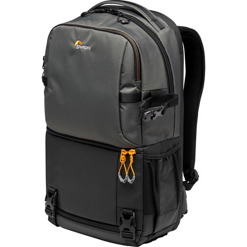 The gray Fastpack BP 250 AW III from Lowepro is a versatile backpack that features two main compartments, including a camera compartment along the base of the bag that can be used to hold a small DSLR or mirrorless camera body with three or four lenses, including an attached 24-70mm f/2.8 lens. Positioned so that it can be reached when the bag is rotated from one’s back to front with its left side facing upward, the camera compartment’s zippered, peel-away opening includes an internal clip system that allows the wearer to ensure that the zippered opening provides side access only. Alternatively, the clip system can be released so that the peel-away opening can be fully unzipped and retracted, enabling complete access to the camera compartment such as when the bag is placed on a flat surface with its backpack straps facing downward. Above the camera compartment, a top-facing zippered storage compartment can accommodate packable clothing and features organizer pockets which can be used to store travel documents, camera batteries, memory cards, or small electronics.