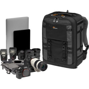 The black, 32L Pro Trekker BP 450 AW II Backpack from Lowepro is ideal for protecting your gear during travel. It will hold a DSLR with a portrait grip and attached 70- 200mm lens, plus a larger telephoto lens, three additional lenses, and accessories. Alternatively, it can accommodate a video kit with a 70-200mm lens, a foldable drone with a controller, three lenses, and two flash units Fully customizable MaxFit divider system features pocket dividers, a split level divider for stacked flash units, and a removable gear box that can be stored in the pack or under the compression lid. The CradleFit sleeve in the front pocket will hold a 15″ laptop and a 10″ tablet.