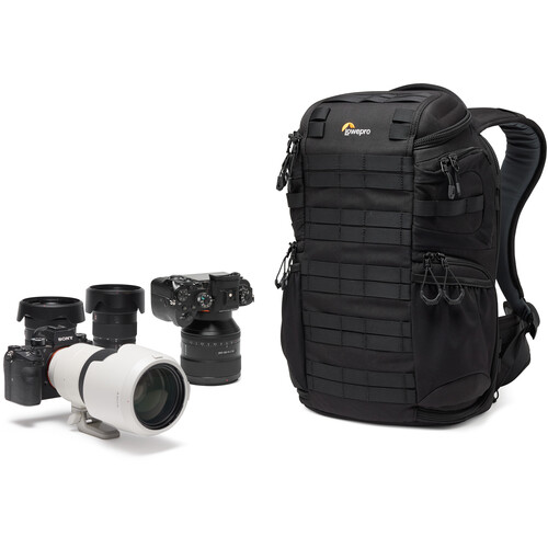 Keep your pro DSLR kit with long lenses and other gear protected in the 17L, black ProTactic BP 350 AW III Backpack. Featuring multiple ways to quickly access your gear including side doors, a wide top, and full back entry, the pack has MaxFit dividers so you can customize the interior to fit your needs. A CradleFit pocket stores your 14″ laptop, and the hybrid webbing attach system is compatible with SlipLock tabs and MOLLE/PALS pouches.
