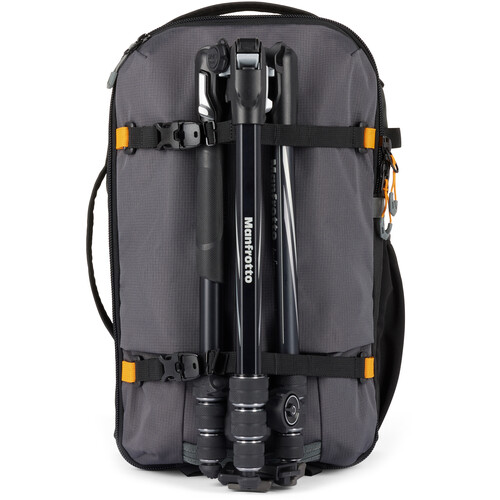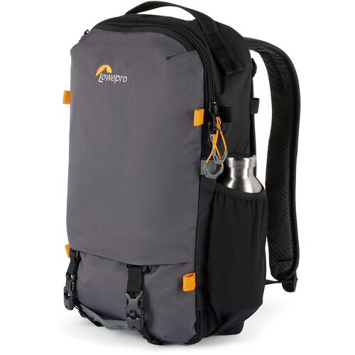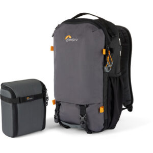 The gray, 18.5L Trekker Lite BP 150 AW AW Backpack from Lowepro has a soft structure, separate compartments, and customizable inserts. The pack accommodates a Sony a6000 or similar-sized camera with an attached lens, two additional small lenses, or a charger and a battery. Alternatively, it will hold a DJI Mavic Air 2 or similar small drone. A dedicated sleeve stores a 13″ laptop, and there’s extra room for a small tripod and personal items. You can easily configure this bag to meet your needs when traveling. It has a removable camera insert with strap kit and large grab handles on the top, side, and front. The rear of the pack has a hideaway strap system and a separate laptop sleeve. This backpack is essentially three products in one: an accessory strap kit, an everyday travel backpack, and a photo gear insert.