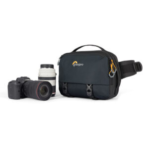 The Trekker Lite SLX 120 from Lowepro is a sling-style bag that accommodates a full-frame mirrorless camera with a lens attached, plus two additional lenses or one 70-200mm lens placed horizontally in the bag. Alternatively, it can hold a foldable drone such as a DJI Mavic Pro with accessories. There’s a sleeve for a 10.5″ tablet, and two straps on the bottom hold a compact tripod such as a GorillaPod 5K, or a water bottle in the included holder. You can also use the bottom straps to carry a small rolled-up jacket. The shoulder strap is adjustable and can be positioned on the right side, the left side, or horizontally for carrying options.