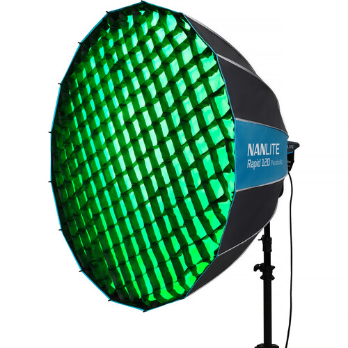 Great for glowing fashion shoots or elegant group portraits, the 47″ Rapid 120 Parabolic Softbox from Nanlite is a 16-sided modifier featuring a deep, circular design that produces a crisp and focused output with less spill.