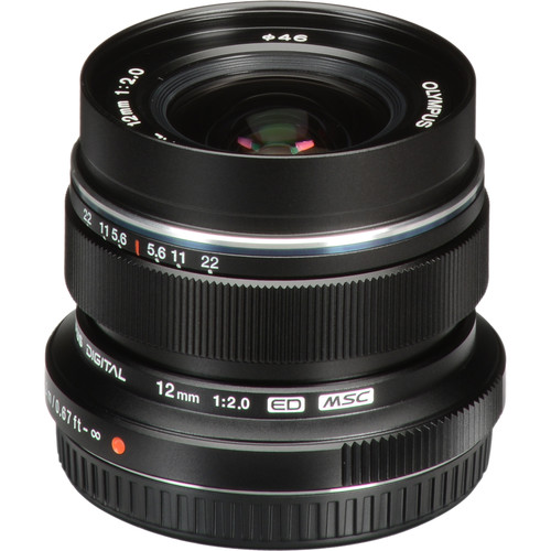 A compact wide-angle prime with intuitive handling and an advanced optical design, the black M.Zuiko Digital ED 12mm f/2 from Olympus is a 24mm equivalent lens for Micro Four Thirds mirrorless cameras.