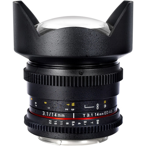 The Samyang 14mm T3.1 Cine Lens for Canon EF-Mount is optimized for film and video applications. The focus and iris rings feature industry-standard gearing, which provides an interface for use with a follow focus. To aid focus pullers, aperture and focus scales are marked on the side of the lens. This 14mm lens produces a 115.7°, ultra-wide angle-of-view when used with a full-frame or 35mm camera. Hybrid aspherical lenses render sharply defined images with a minimum of distortion and chromatic aberrations, and the minimum focus distance is 11.02″ from the lens.
