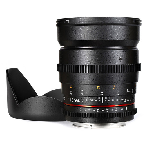 The Samyang 24mm cine lens is compatible with full-frame sensors. APS-C sensors with a crop factor of 1.5 will exhibit a 35mm equivalent angle-of-view of approximately 36mm. The optical construction is comprised of 13 lens elements arranged in 12 groups. Four elements are low-dispersion glass (ED), plus two aspheric elements. The 24mm features Ultra Multi Coated (UMC) multi-coated lenses for improved light transmission and resistance to ghosting and flares.