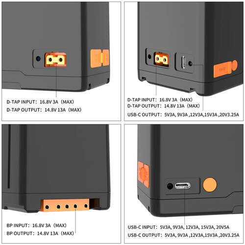 One of the USB-C ports can utilize PD fast chargers, which can charge the battery to full in 2.5 hours with a 100W PD charger or 3.5 hours via a 65W PD charger. The D-Tap port and one of the USB-C ports can be used as an input to charge the battery using an optional fast charger, or a standard V-mount charger can charge the battery. The V160 features multiple circuit protection features, including overcurrent, overpower, overvoltage, overcharge, short circuit, temperature, and reset protection.